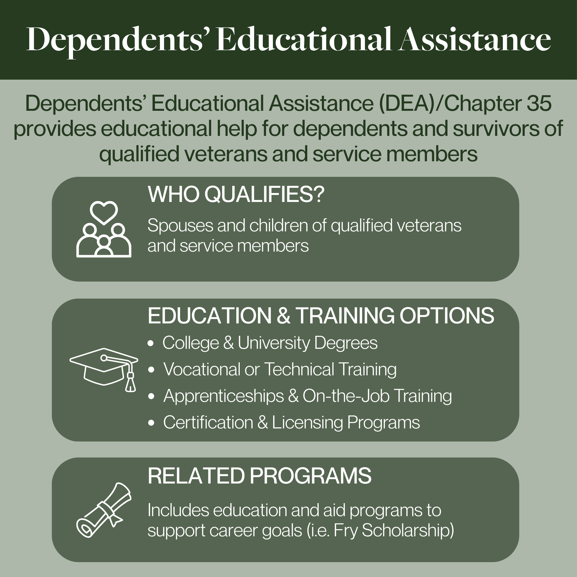 Dependents’ Educational Assistance (DEA), also known as Chapter 35 benefits, is a VA education program that provides financial support for schooling and training to eligible dependents of certain veterans. DEA benefits are most commonly available to spouses and children of veterans who are permanently and totally disabled due to service-connected conditions or who died as a result of service.