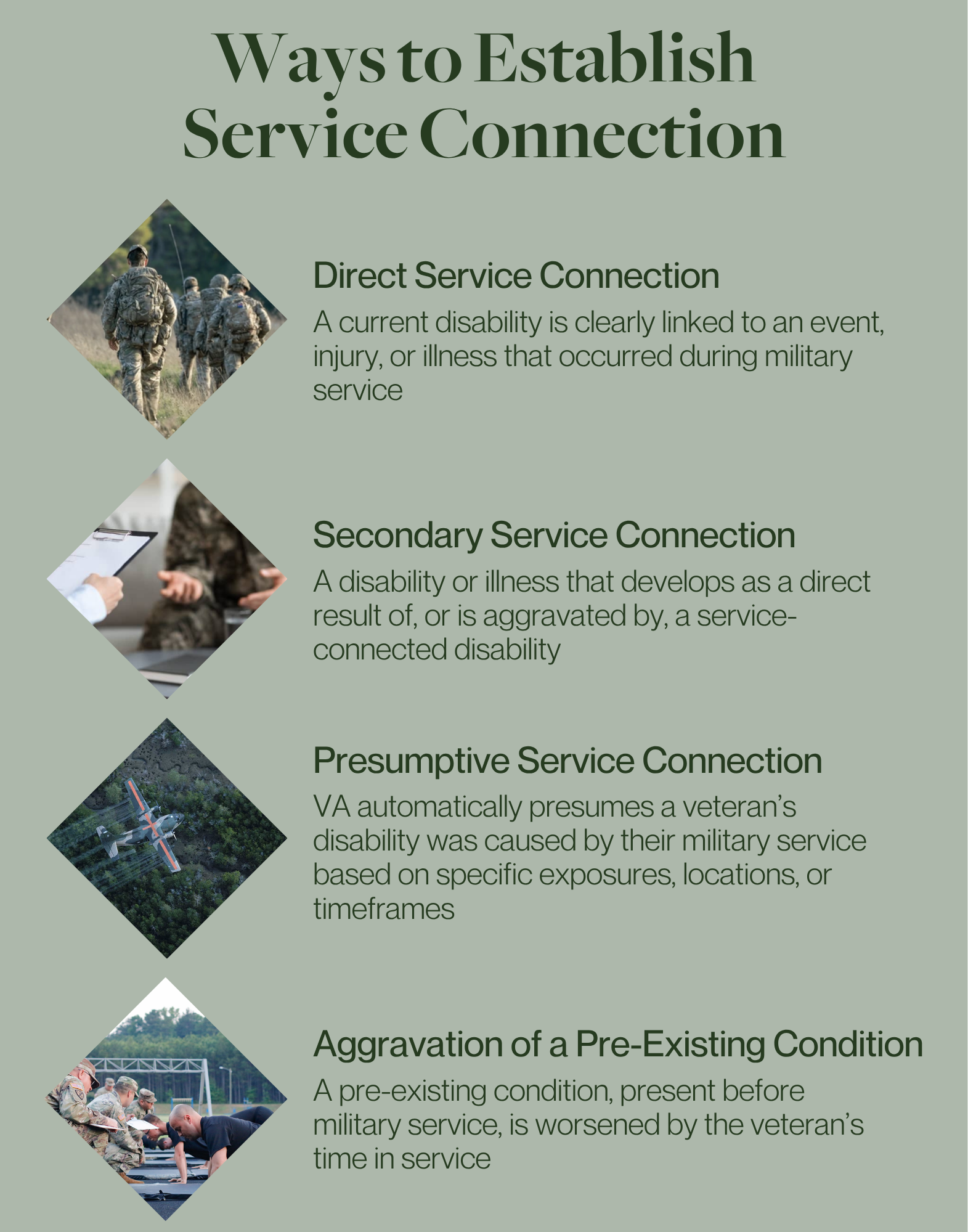 Important to Know: Service connection may be established through multiple legal theories, including direct, secondary, presumptive, or aggravation.