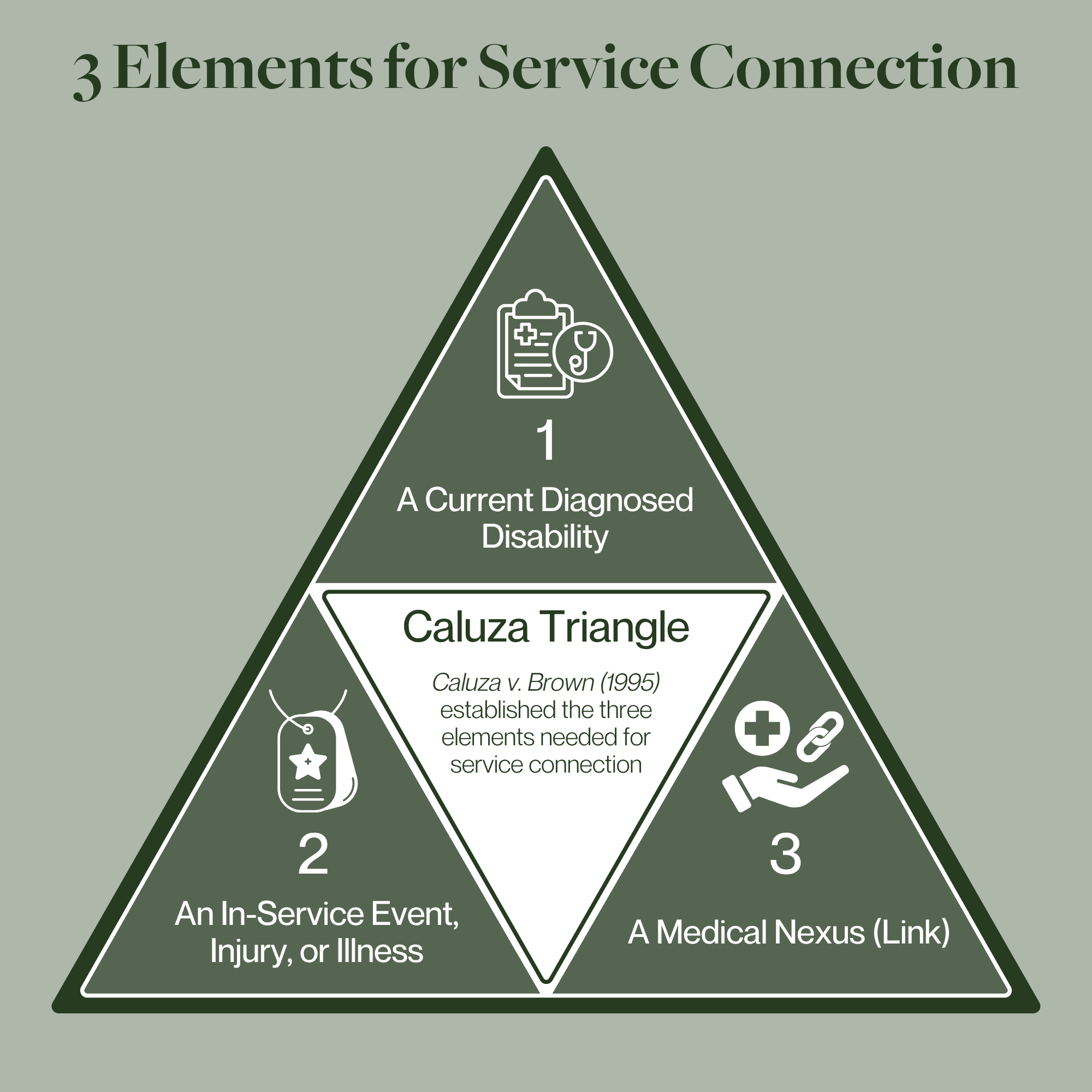The most common type of service connection (direct service connection) requires three core elements: a current disability, an in-service event or exposure, and a medical nexus linking the two.